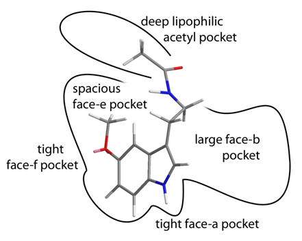 It is apparent that the pyrrole group is not involved in H-bonding. Whilst the pyrrole binding pocket is not particularly large, it is tolerant of a wide array of diverse functionality. This provides many opportunities for tailoring the kinetic profile. Indeed all current commercial melatonergic drugs exploit this tolerance to extend the elimination half-life. Homologation of the acetyl group is also a convenient way to enhance lipophilicity and thus drug kinetics.