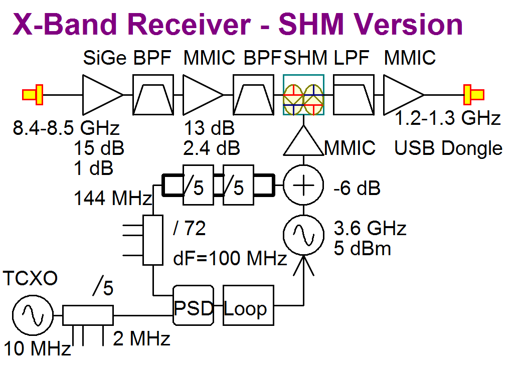 Illustration 1 shows a simple down converter with two cascaded RF LNA, SHM and IF output LNA. The LO required for 8.4-8.5 GHz RF input and 1.2-1.3 GHz IF output is 3.6 GHz (twice this is 7.2 GHz). Many inexpensive divider ICs will operate well at 3.6 GHz but those specified for 7.2 GHz require a third supplier (potentially Hittite). The SHM approach is convenient and allows /5 ICs (or /4) to be used, available from Digikey (NZ). Using two dividers produces 144 MHz, easily processed by an integer-N parallel load divider such as the IDT674-01. This will be divided by 72 producing an output frequency at 2 MHz.
